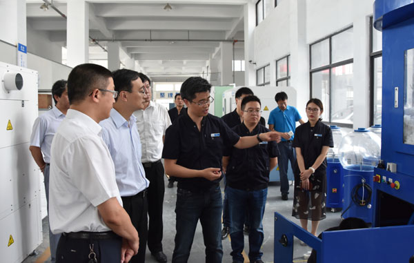 在調研參觀期間,市委書記一行參觀了百聯的生產、裝配車間以及成品倉庫,對百聯自主研發的應用于服裝行業的全自動稱重充絨機、充棉機,家紡行業的全自動羽絨被充絨機,玩偶行業的全自動充填機以及電商行業自動發貨包裝機等“耳目一新”的產品進行了解,還參觀了公司研發部,并在演示間觀看了相關產品的視頻,深入了解產品特性及海內外市場情況。